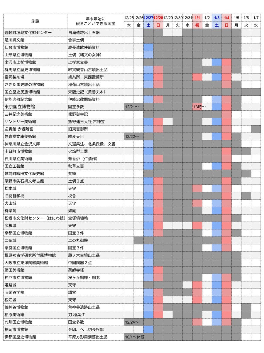国宝の観られる美術館・博物館・建築 年末年始カレンダー